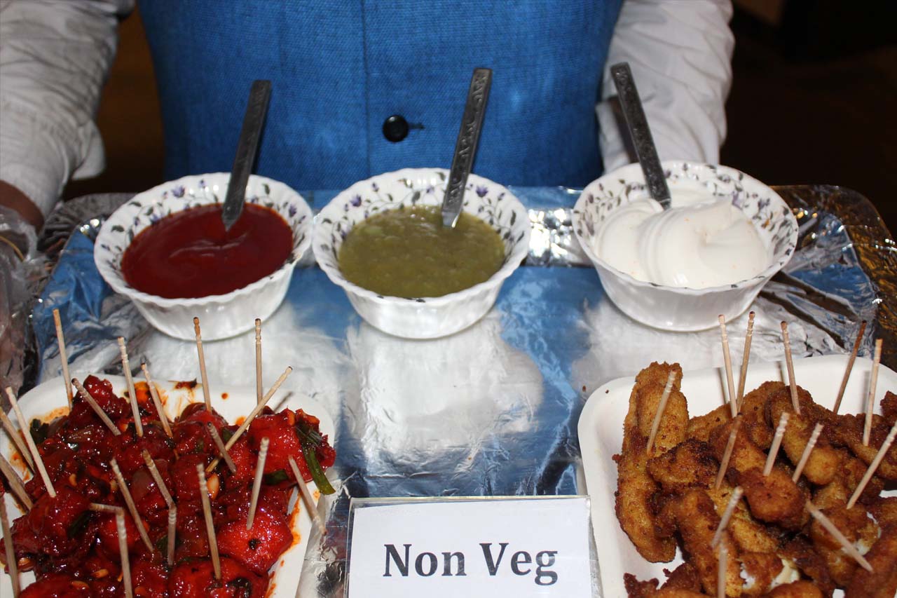 Kulcha or Chappati, Panner butter Masala, Kashmir Poha, Peas mutter, White Rice, Rasam & Dhal Tadika, Baby Corn, Alu Gobi, Dhahi Voda, Pickles & Papad, Salad, Icecream, Sweet.