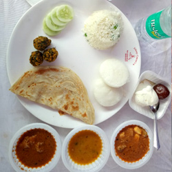 Mutton Biryani, Dal-Fry,Chicken Dry (Smoked),Fish (Tawa Fry),Roti (idi-appam),Chicken Chittinad, Prawns, Sweet, Ice Cream.
